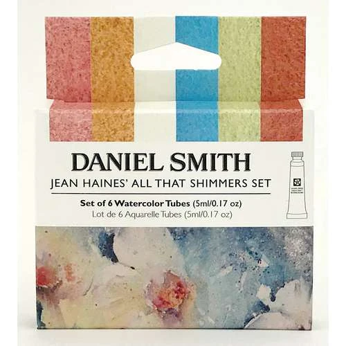The Daniel Smith Watercolour Set “All that Shimmers” contains 6 x 5ml tubes of extra fine watercolour paint in shimmering colours. It was developed in collaboration with the famous artist Jean Haine.