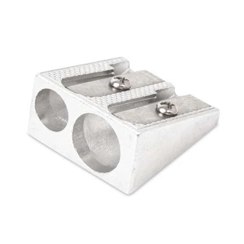 These Double Pencil Sharpeners are made of metal and have two holes (d 7.8 and 11mm). They are a wedge shape.