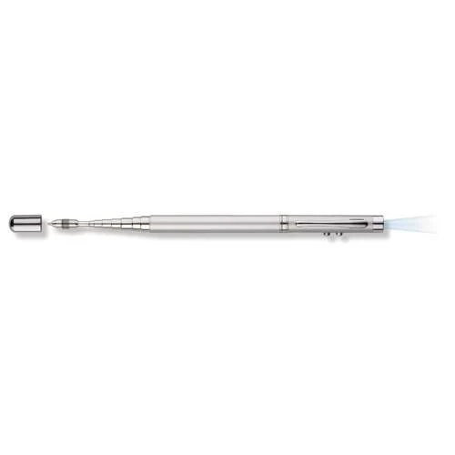 This Ecobra Telescopic Laser Pointer has a white LED light, integrated ballpoint pen with screw cap and a high-gloss chrome-plated clip. It is ideal for presentations.