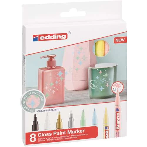 The Edding 751 8 Pastel Gloss Marker Creative Set contains 8 paint markers presented in a high-quality, reusable case. They are ideal for highly opaque, permanent and smudge-proof writing and decorating.