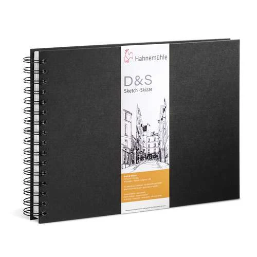Hahnemühle spiral-bound D&S sketchbooks, made up of 96 pages of 140gsm, natural white, acid-free sketching paper, with a black cover.