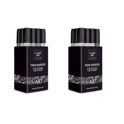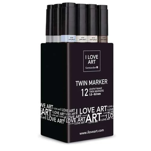 These I Love Art Twin Marker Grey Tones Sets contain 12 marker pens. I Love Art Twin Markers have 2 different tips: a 1 mm fine point and a 2-6 mm chisel tip. They are ideal for sketching, drawing and illustration.