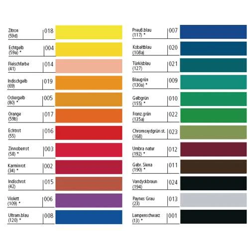 The 24-pan set includes the following colours: Lamp Black, Carmine Red, Vermilion, Real Yellow, Yellow Ochre, Violet, Prussian Blue, Ultramarine, Blue Green, Yellow Green, Burnt Sienna, Natural Umber, Paynes Grey, Flesh Colour, Indian Red, Real Red, Orange, Lemon, Indian Yellow, Cobalt Blue, Turquoise Blue, French Green, Chrome Oxide Green and Van Dyke Brown.