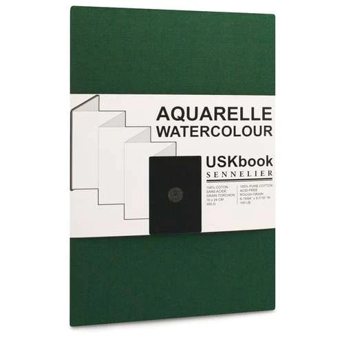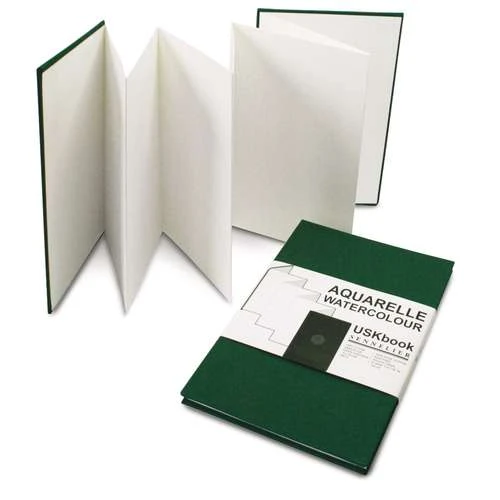 This Sennelier sketchbook contains acid-free, 300gdm watercolour paper, bound in an accordian format, with a green cover.