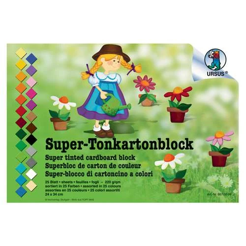 Super coloured cardboard block, containing 25 24cmx34cm sheets of 220gsm card, in different colours.