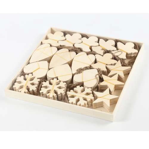 These Wooden Christmas Tree Decorations are sold in packs of 90, in 6 different shapes, delivered in a papier-mâché box. They are made from fine light plywood and are plain for you to decorate at will.